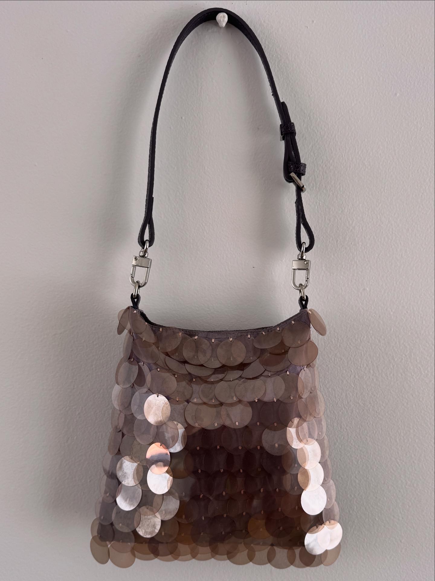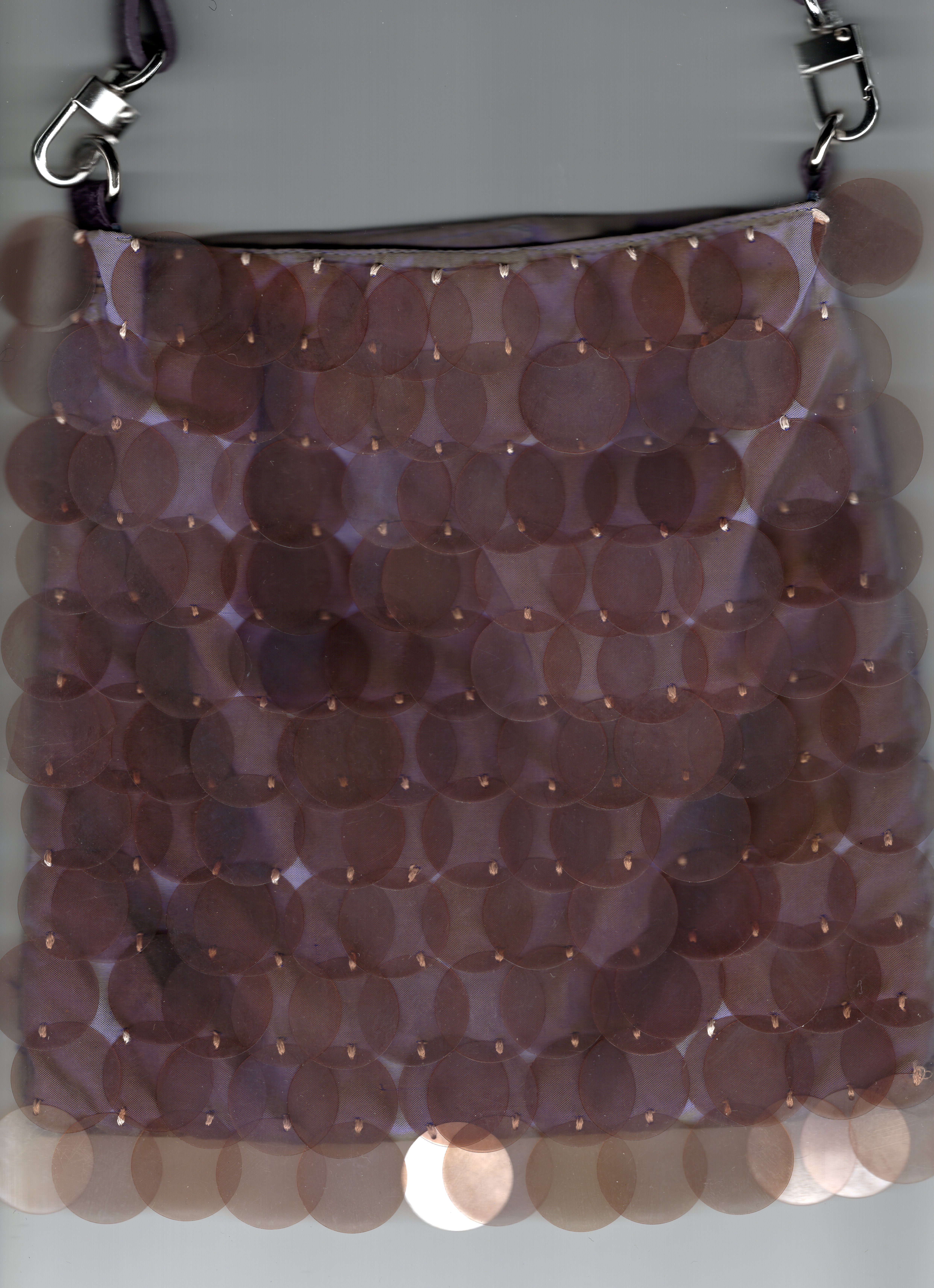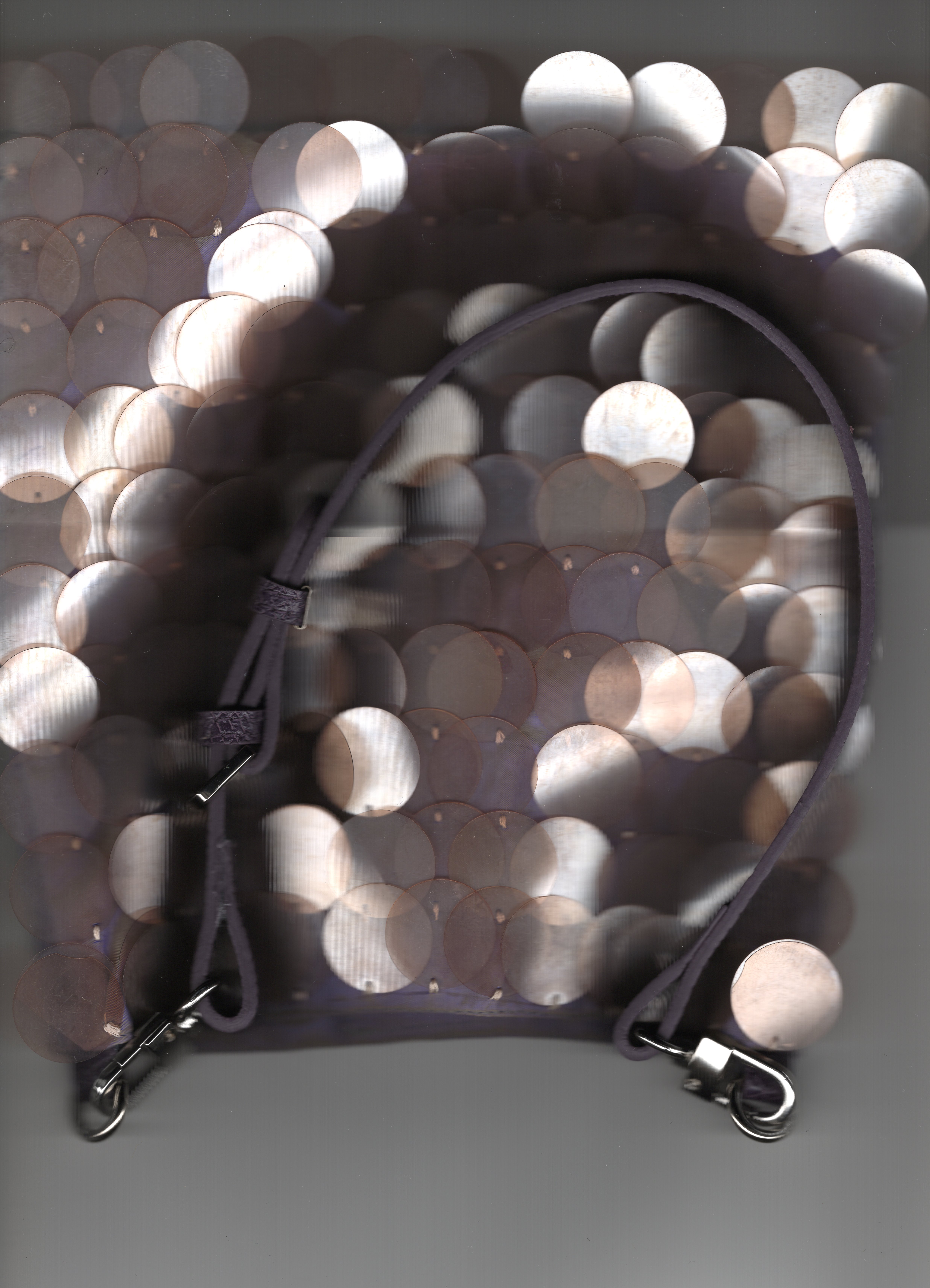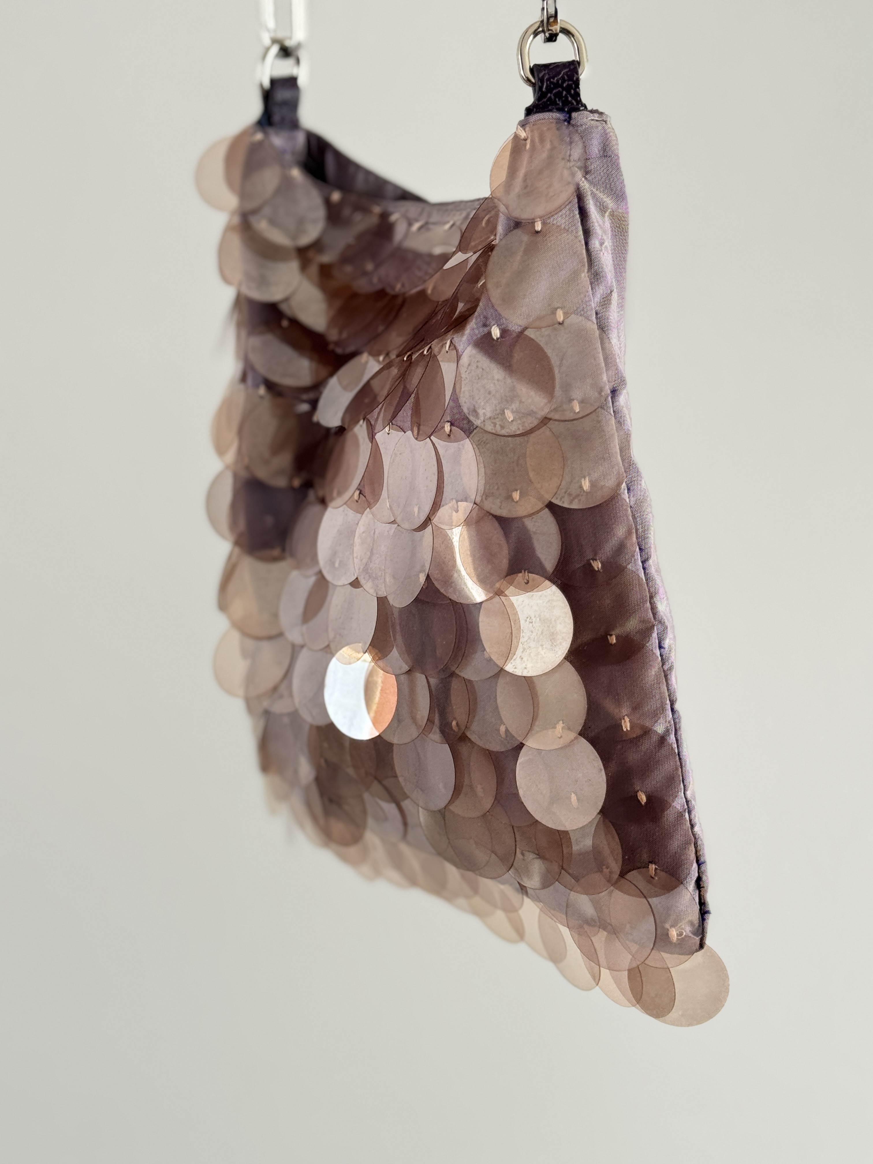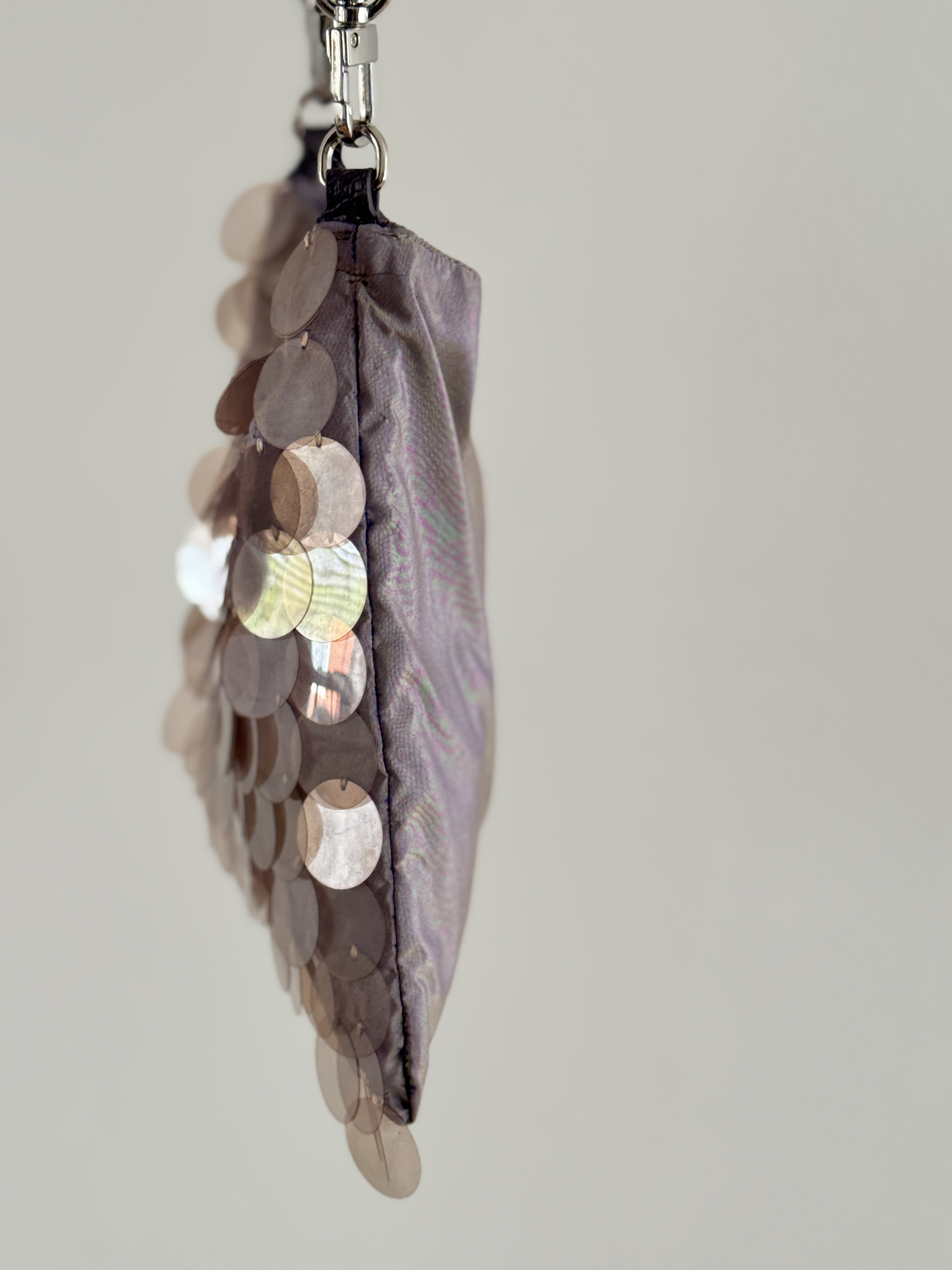 The design draws inspiration from Prada’s late-1990s sequinned shoulder bags, which later informed the development of the Cleo silhouette. Larger sequins sourced during my travels in Korea were paired with purple shot silk dupion sourced from Singapore, allowing material origin and colour to play a key role in the narrative of the piece.