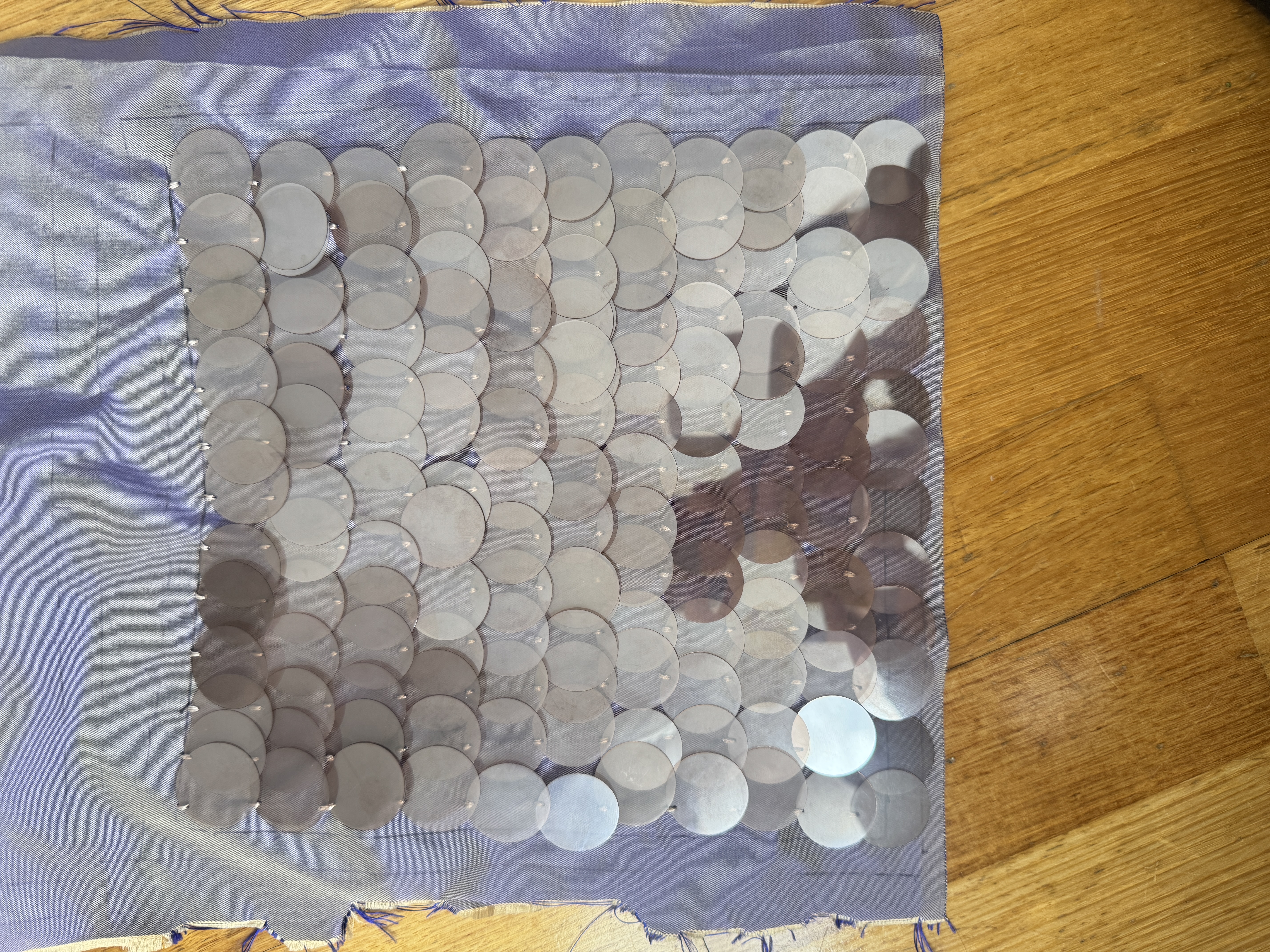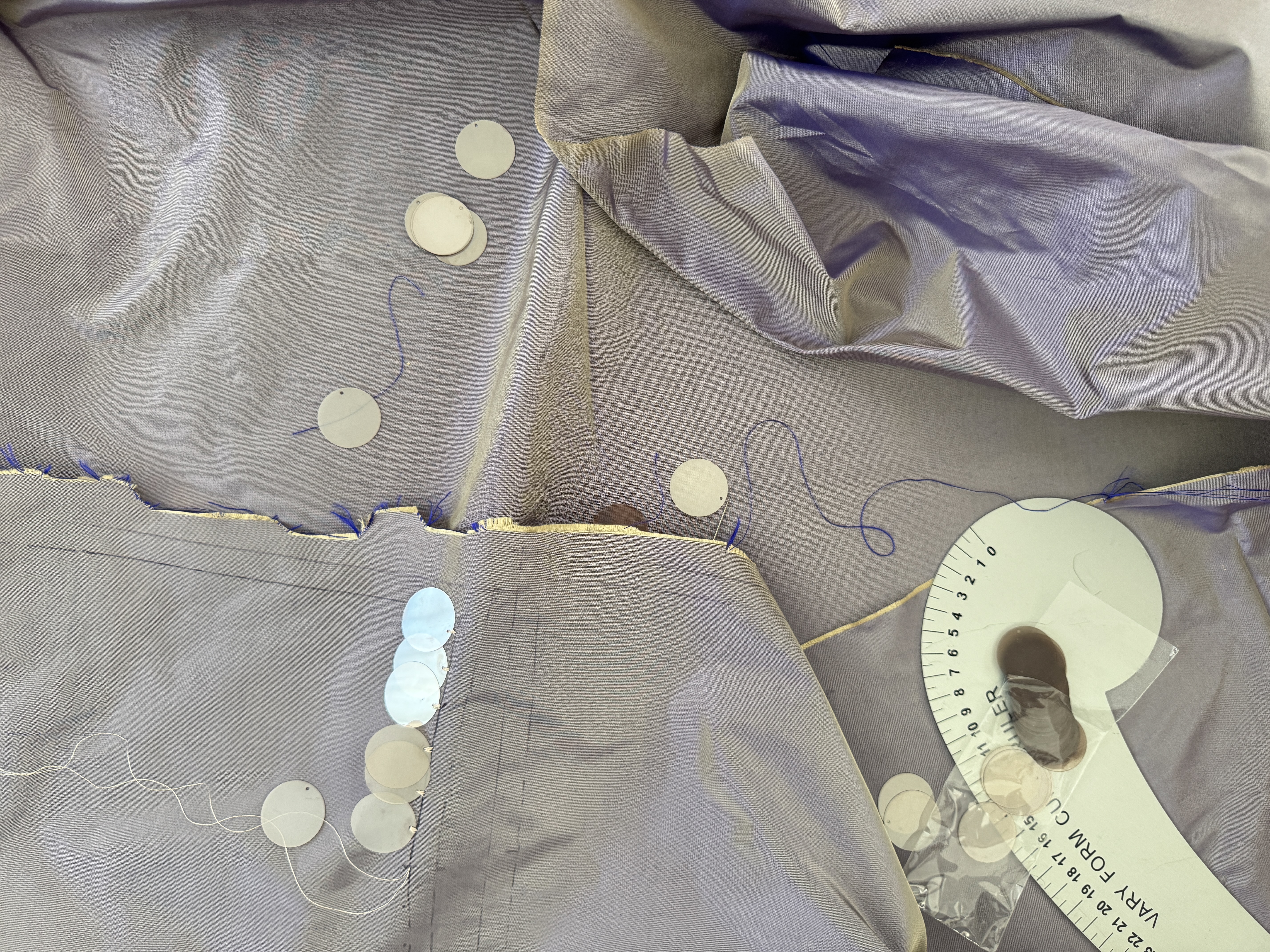 This is a smaller side project through which I am developing my hand-appliqué technique, focusing on the application of sequins onto silk dupion to achieve an even pattern and textured surface. The project explores precision, repetition, and surface manipulation through slow, manual processes.