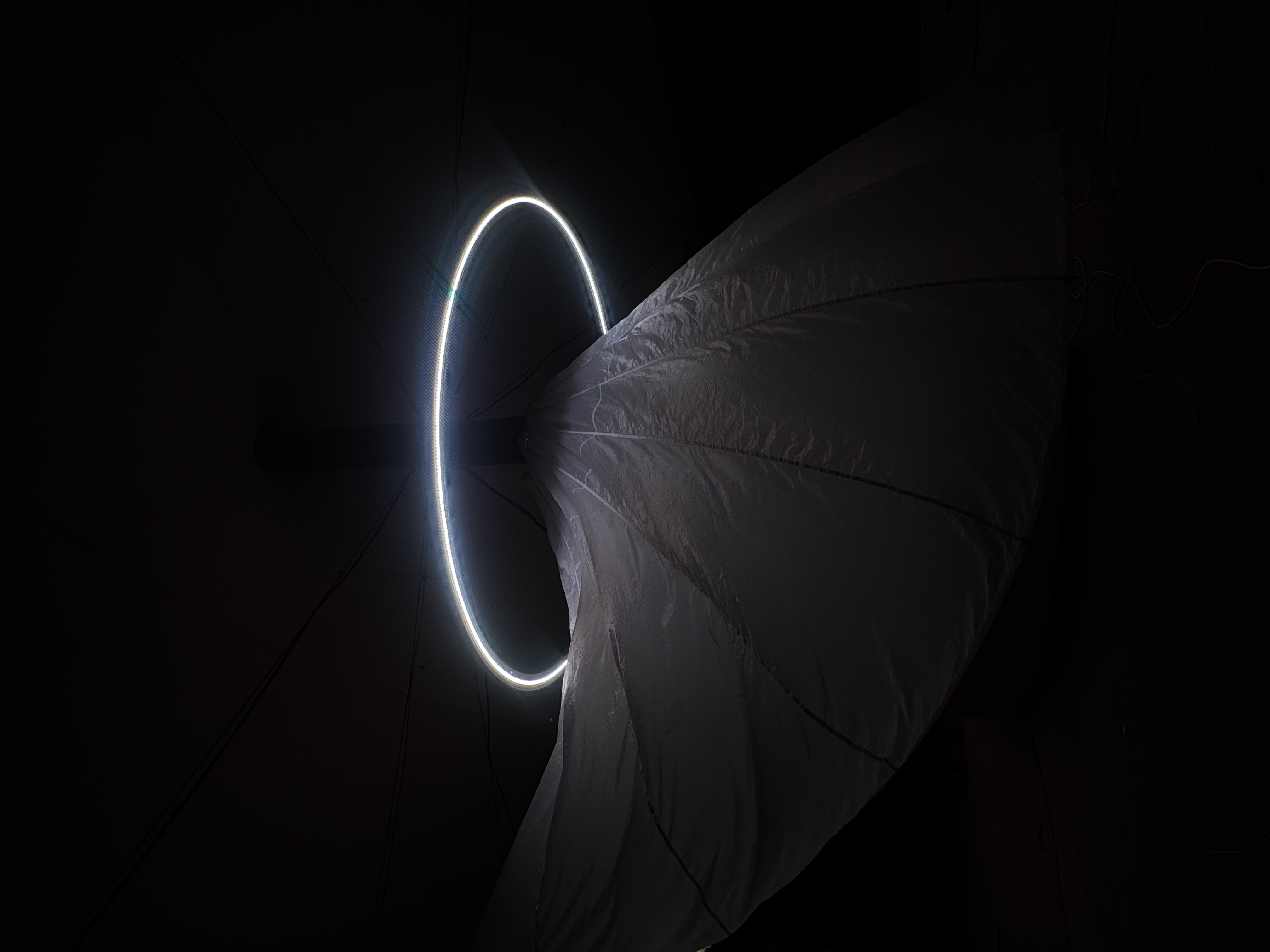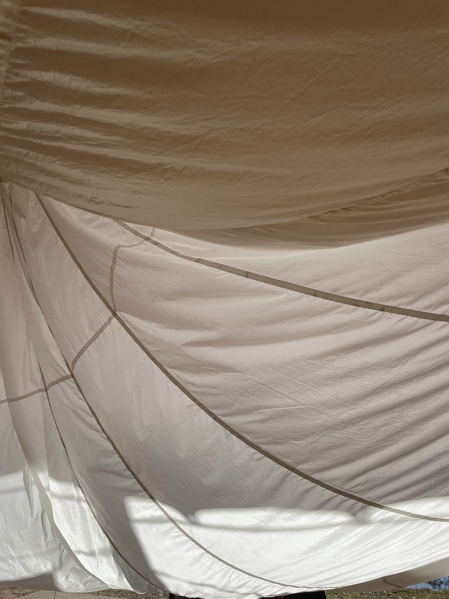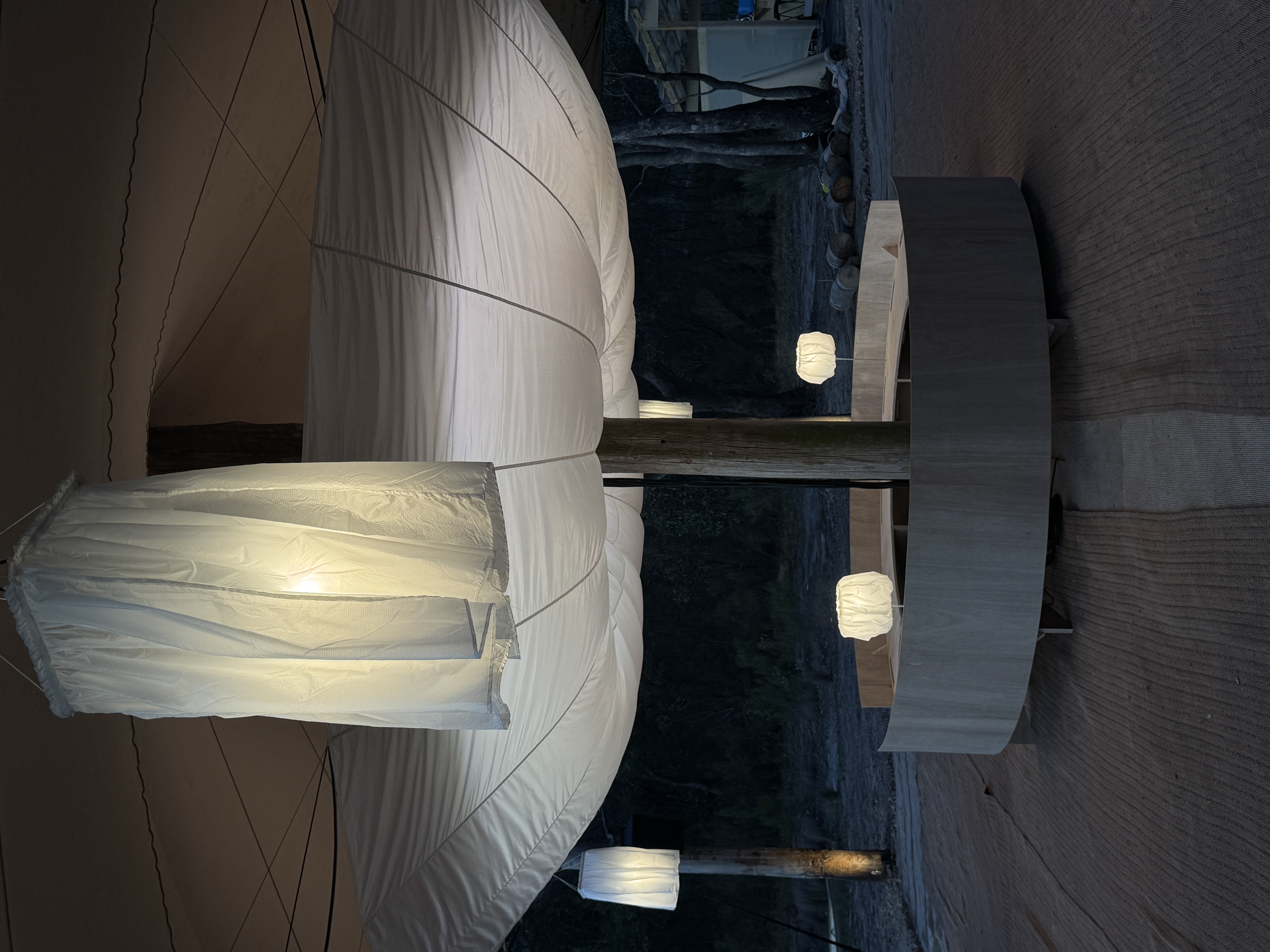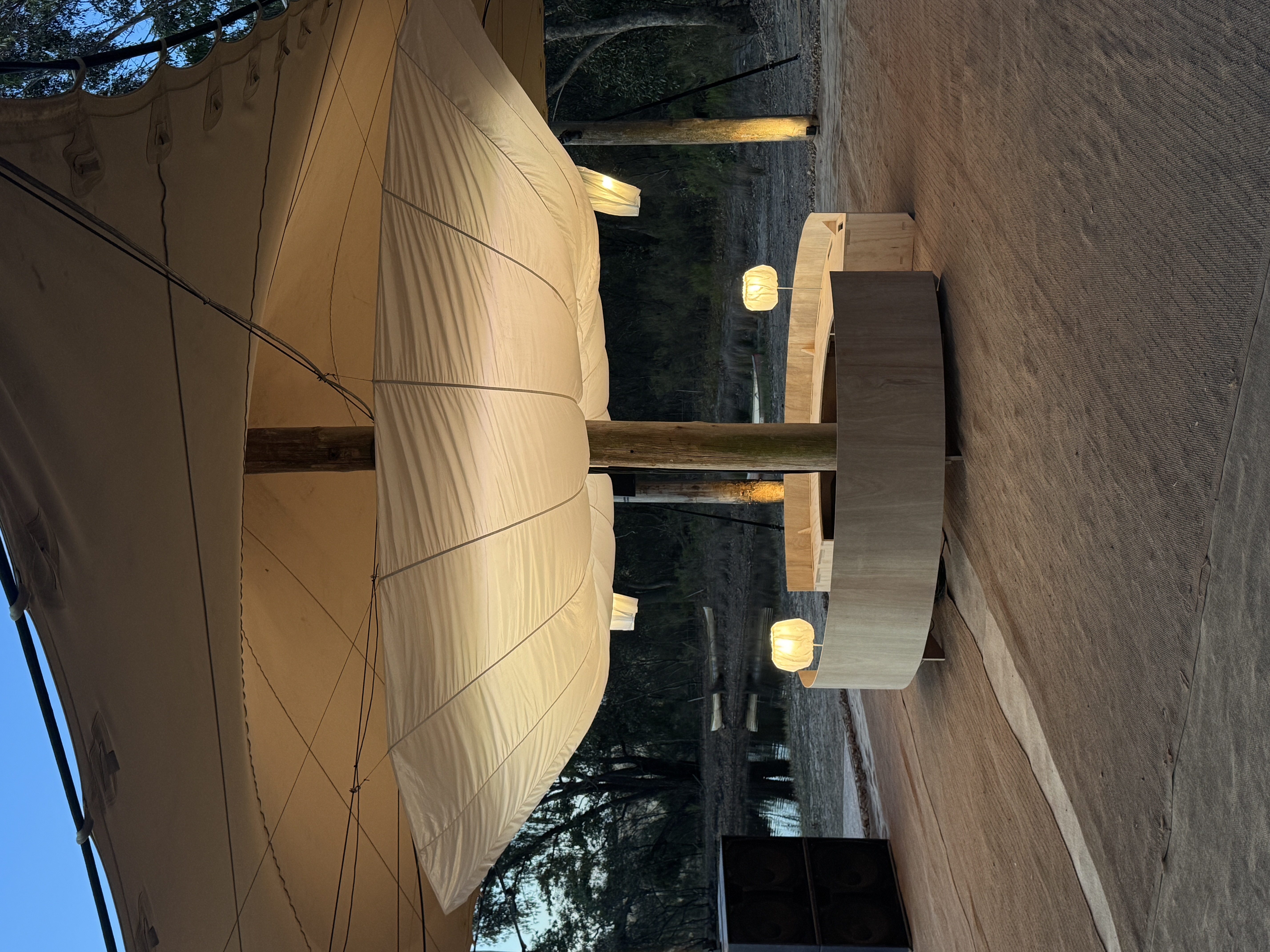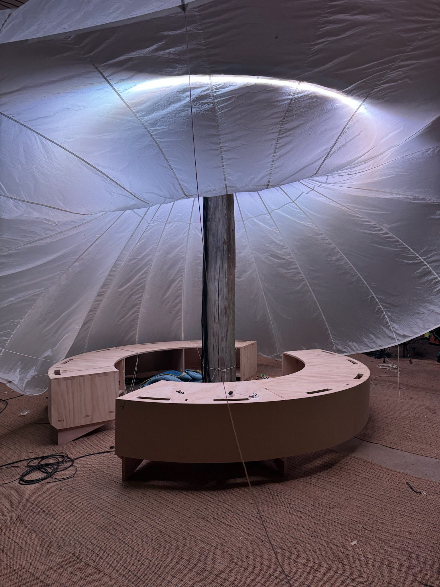 Expired reserve parachutes were selected as the primary material for the lampshades and set elements, embedding sustainability directly into the design process. Originally engineered for emergency and survival, the material was recontextualised into soft architectural forms that provide warmth, orientation, and intimacy within a temporary festival environment. The decision to avoid sourcing new materials was central to the project ethos, allowing the inherent properties and limitations of the parachute fabric to inform form, scale, and construction.